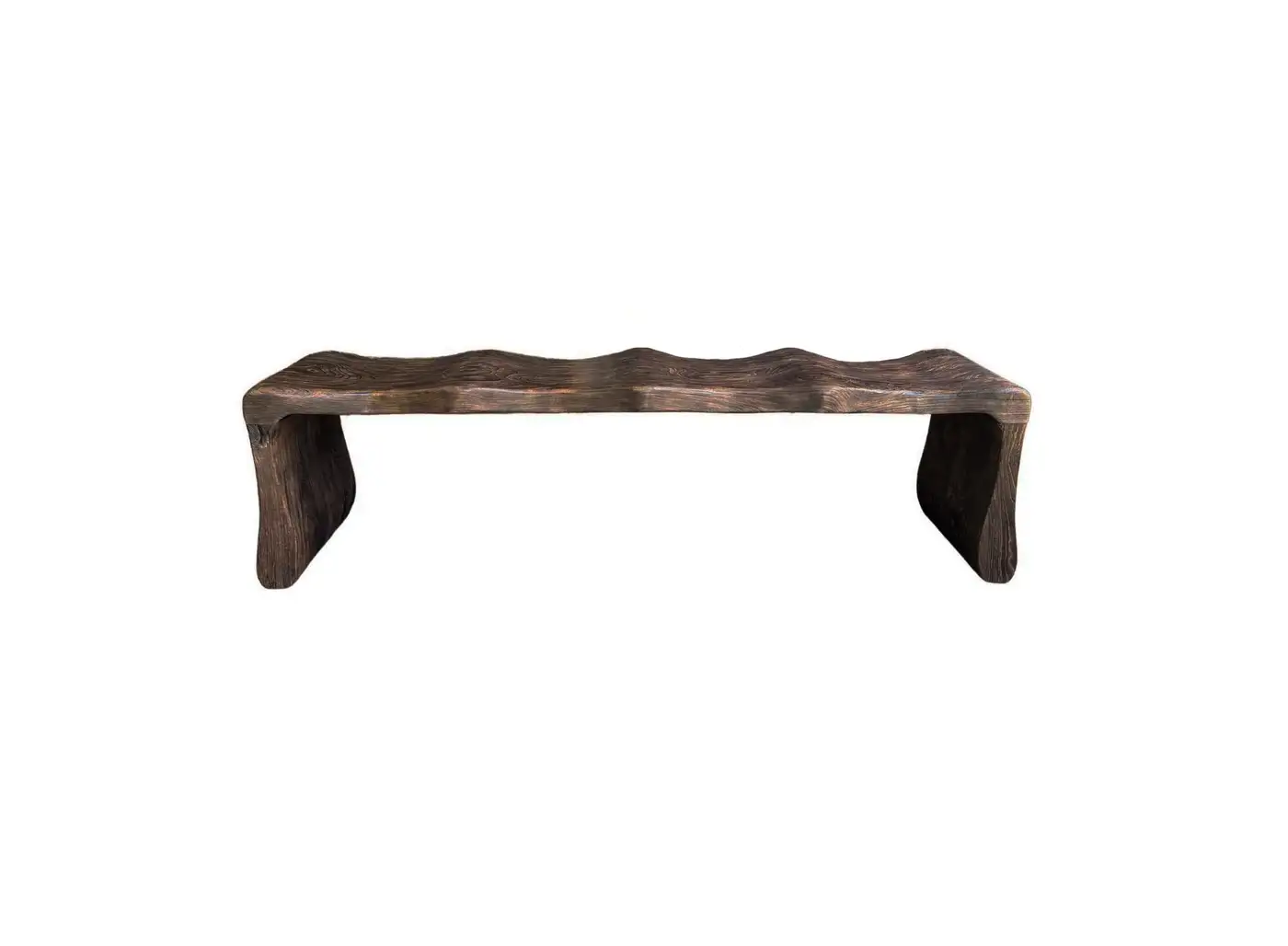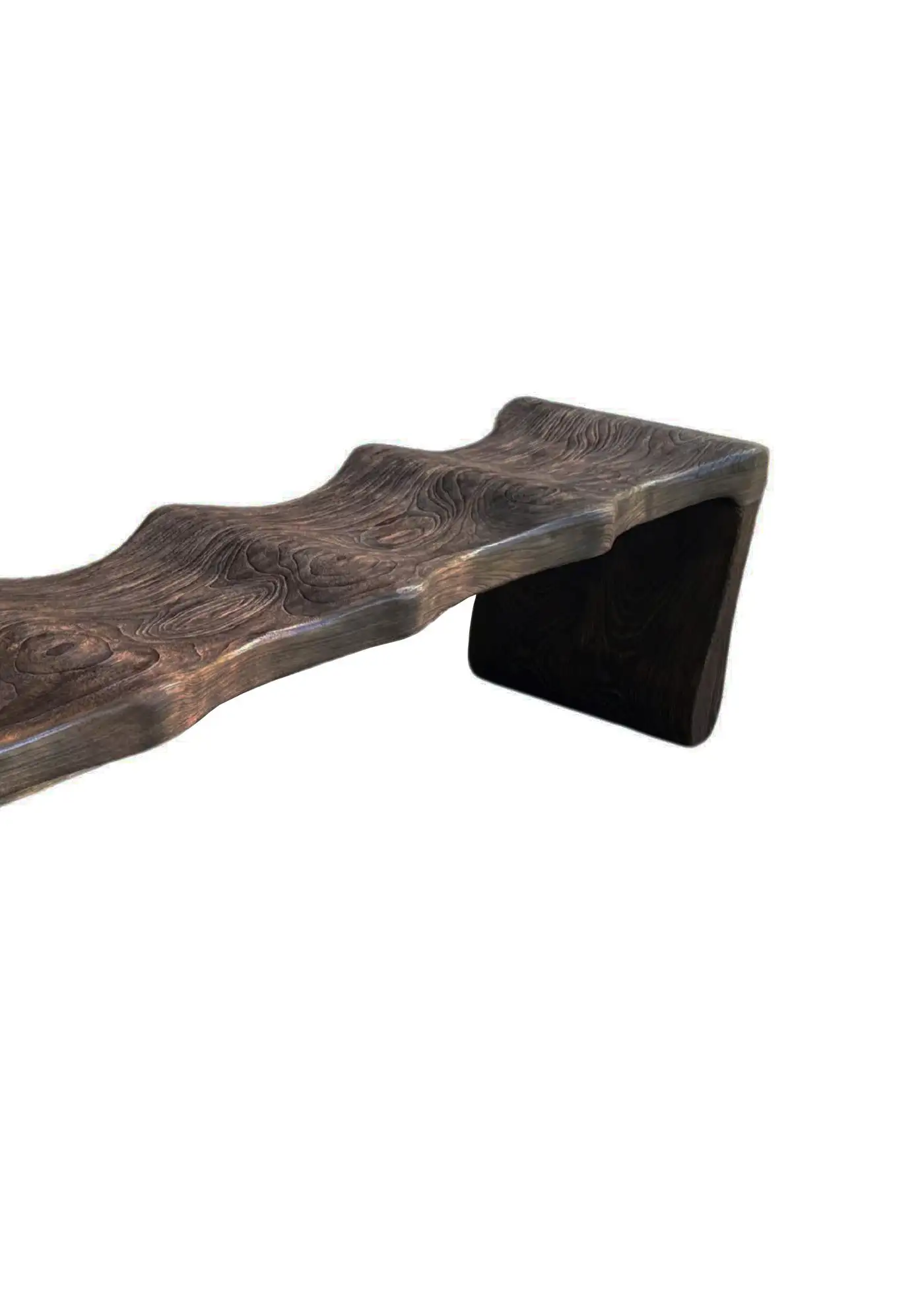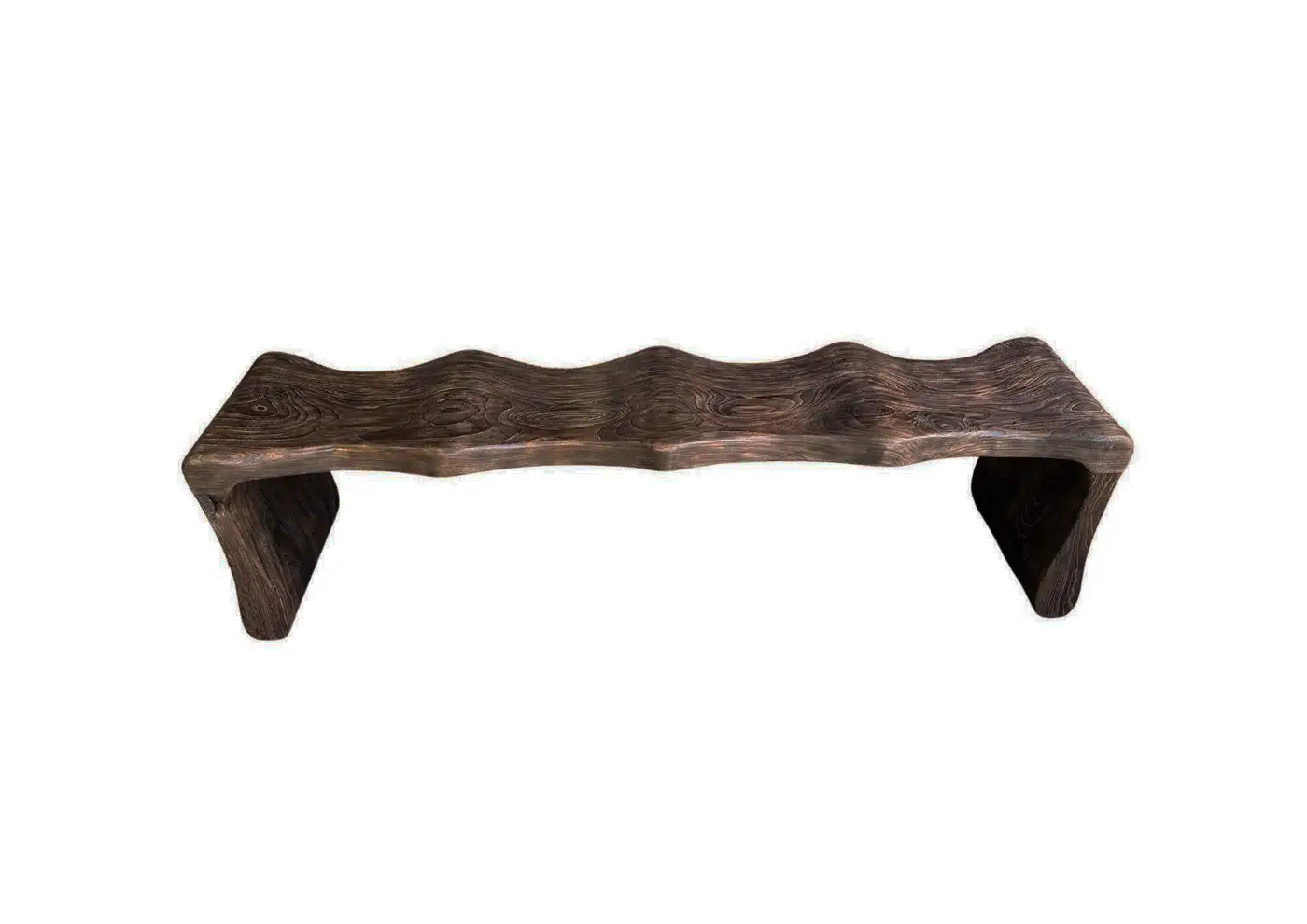 Inspired by the contours of Bamboo, this bench was designed without any straight lines or edges. The bench was meticulously sculpted to the perfect shape from solid teak wood. The wood used to create this bench is reclaimed, sourced from old pillars of traditional Java Houses, from the island of Java, Indonesia. It features a dark brown finish with stunning wood contours and shades that add to its charm. To achieve its dark brown finish the wood was burnt several times and finished with a clear coat. The perfect object to bring warmth to any space. This bench is configured for four persons with curved seats that blend in with the benches form.