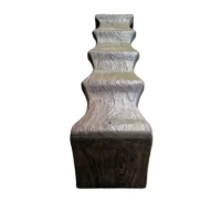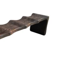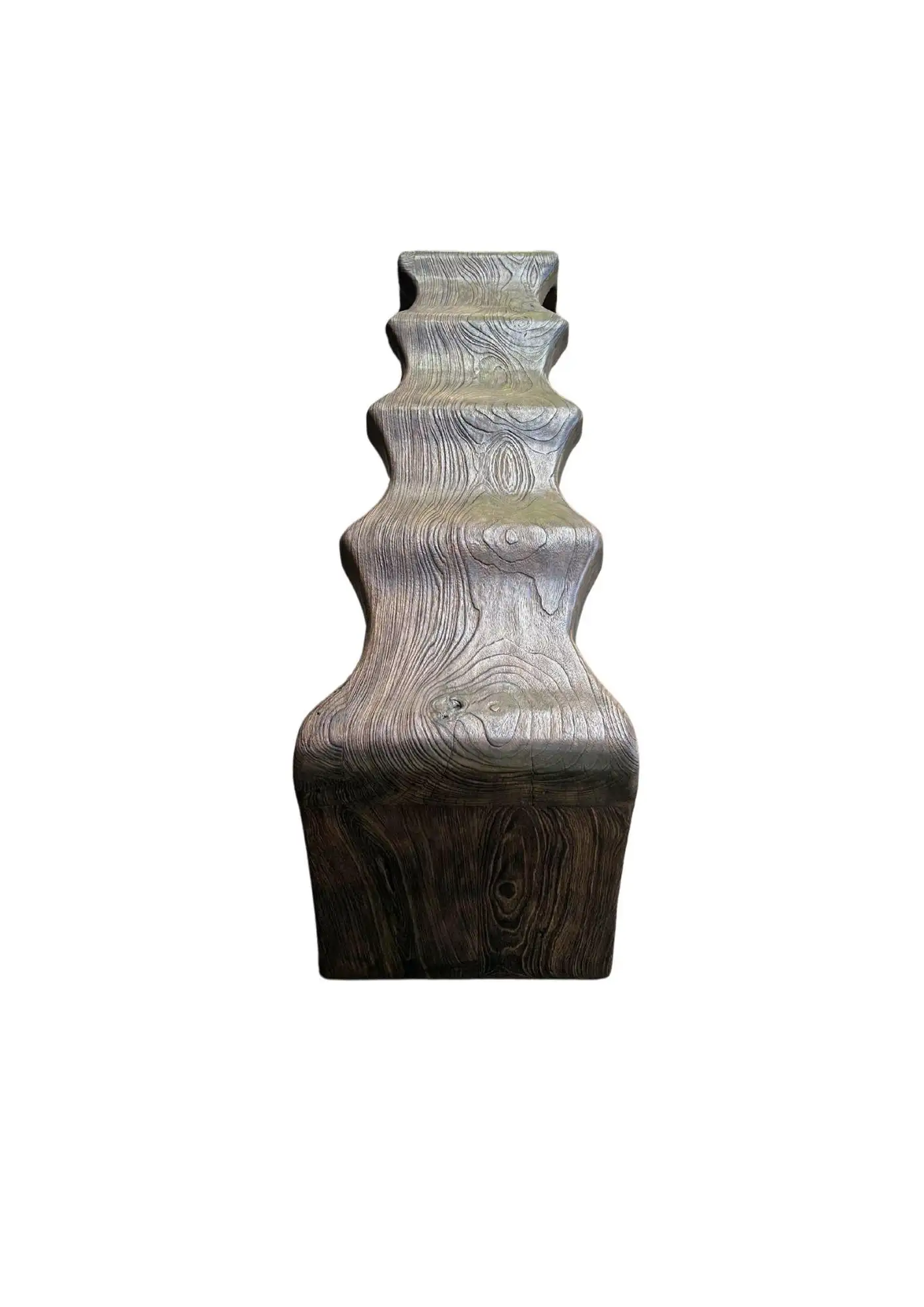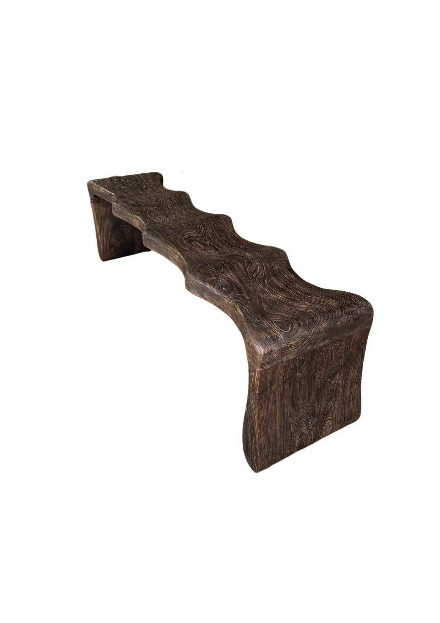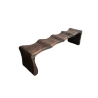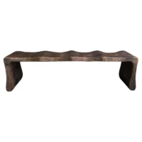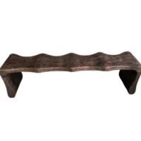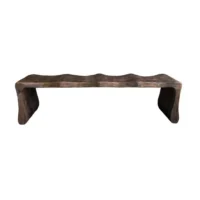 Inspired by the contours of Bamboo, this bench was designed without any straight lines or edges. The bench was meticulously sculpted to the perfect shape from solid teak wood. The wood used to create this bench is reclaimed, sourced from old pillars of traditional Java Houses, from the island of Java, Indonesia. It features a dark brown finish with stunning wood contours and shades that add to its charm. To achieve its dark brown finish the wood was burnt several times and finished with a clear coat. The perfect object to bring warmth to any space. This bench is configured for four persons with curved seats that blend in with the benches form.