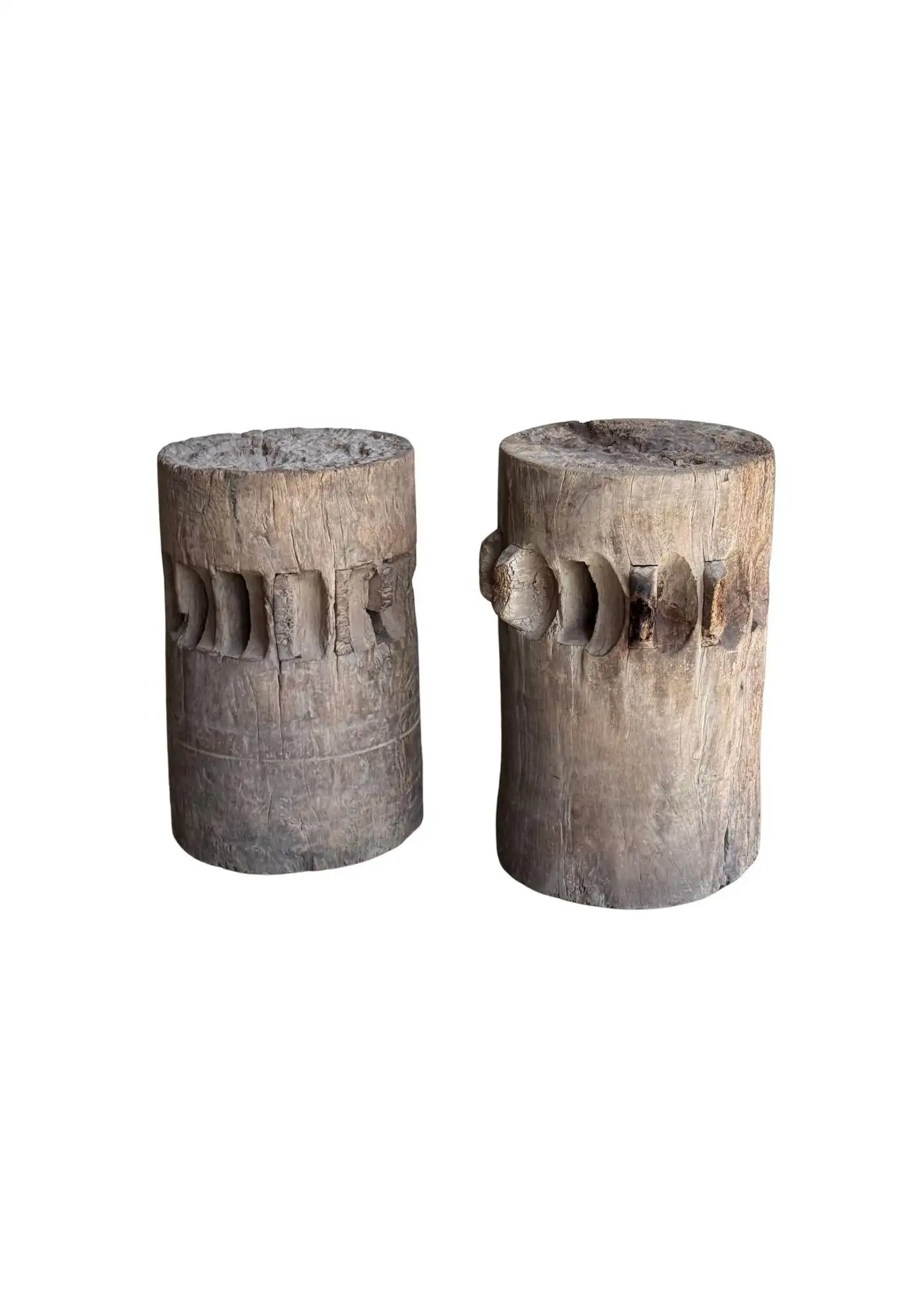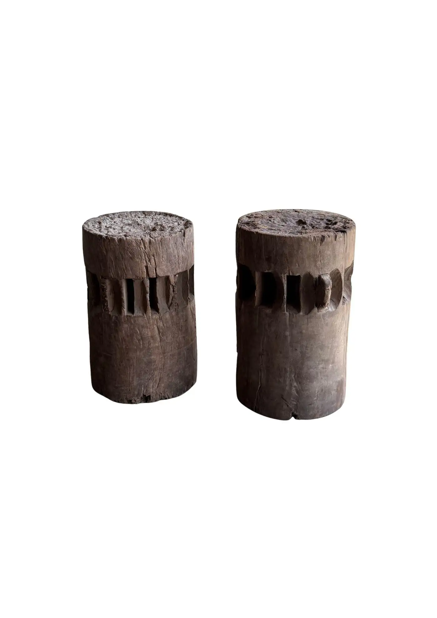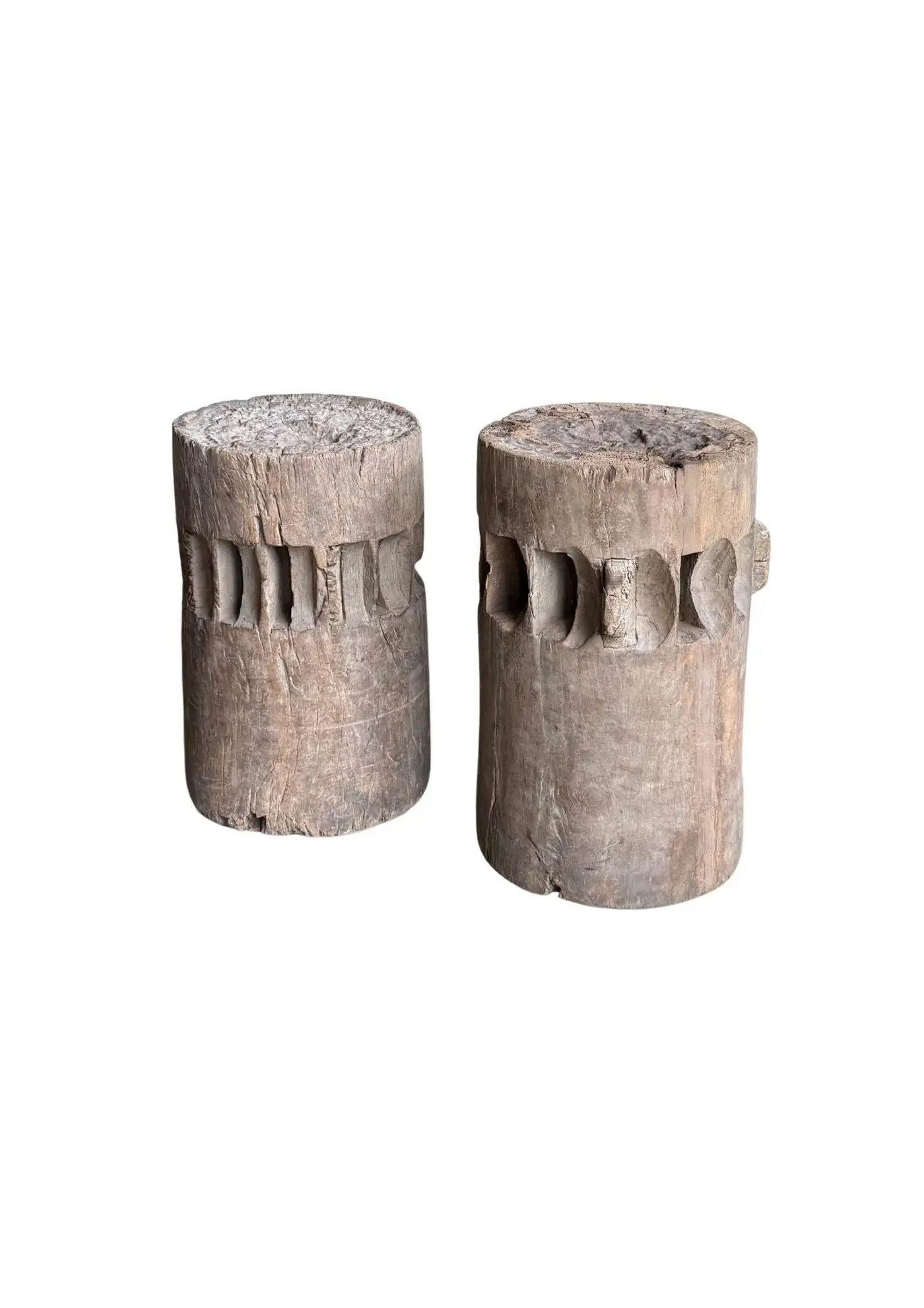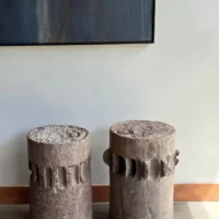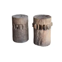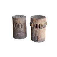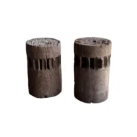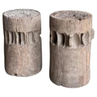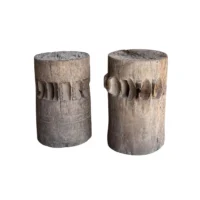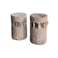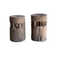 This set of rare antique sugar cane presses stand as a striking example of early agricultural craftsmanship, preserved in their true, unrestored form. Made from solid teakwood, they features stunning, timeworn textures and a deep, natural patina that can only develop through decades of exposure and use. Every surface tells a story—from the weathered wood grain shaped by years of labor to the subtle marks and imperfections that speak to their utilitarian past. Despite their age, the structure remains robust, a testament to the quality of the materials and the skill of its makers. Free from modern restoration, these pieces maintain their authentic character, making them an exceptional collector’s item or a bold decorative statement. Whether displayed in a rustic interior, a heritage collection, or as a sculptural focal point, these sugar cane presses are a true relic of history—raw, honest, and beautifully aged. Detailed Dimensions; Shorter Press: Height 29.5cm (11.61″) x Diameter 27cm (10.62cm)/ Taller Press: Height 49.5cm (19.58″) x Diameter 30cm (11.81″) Diameter with extensions; 33cm (12.99″)