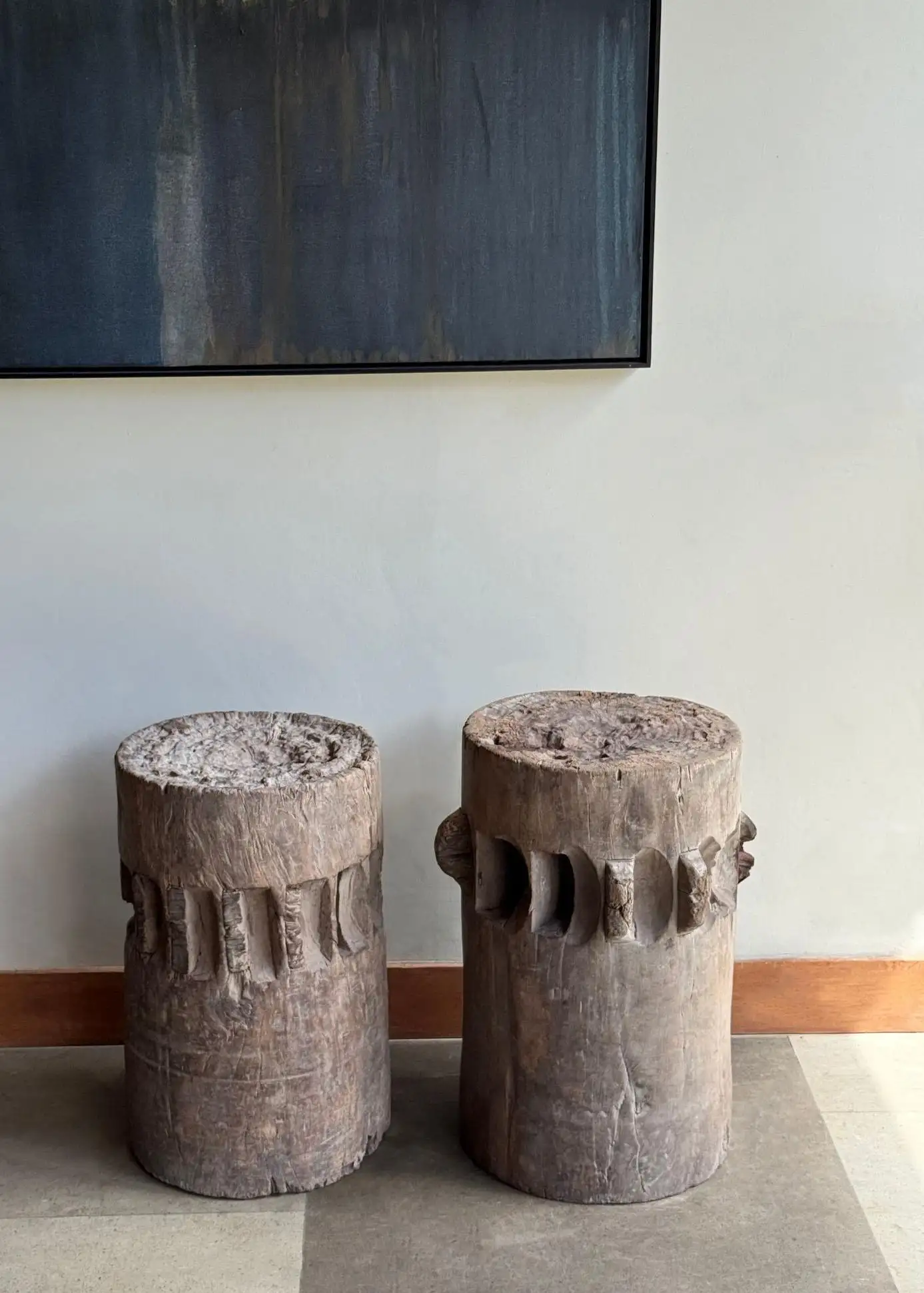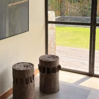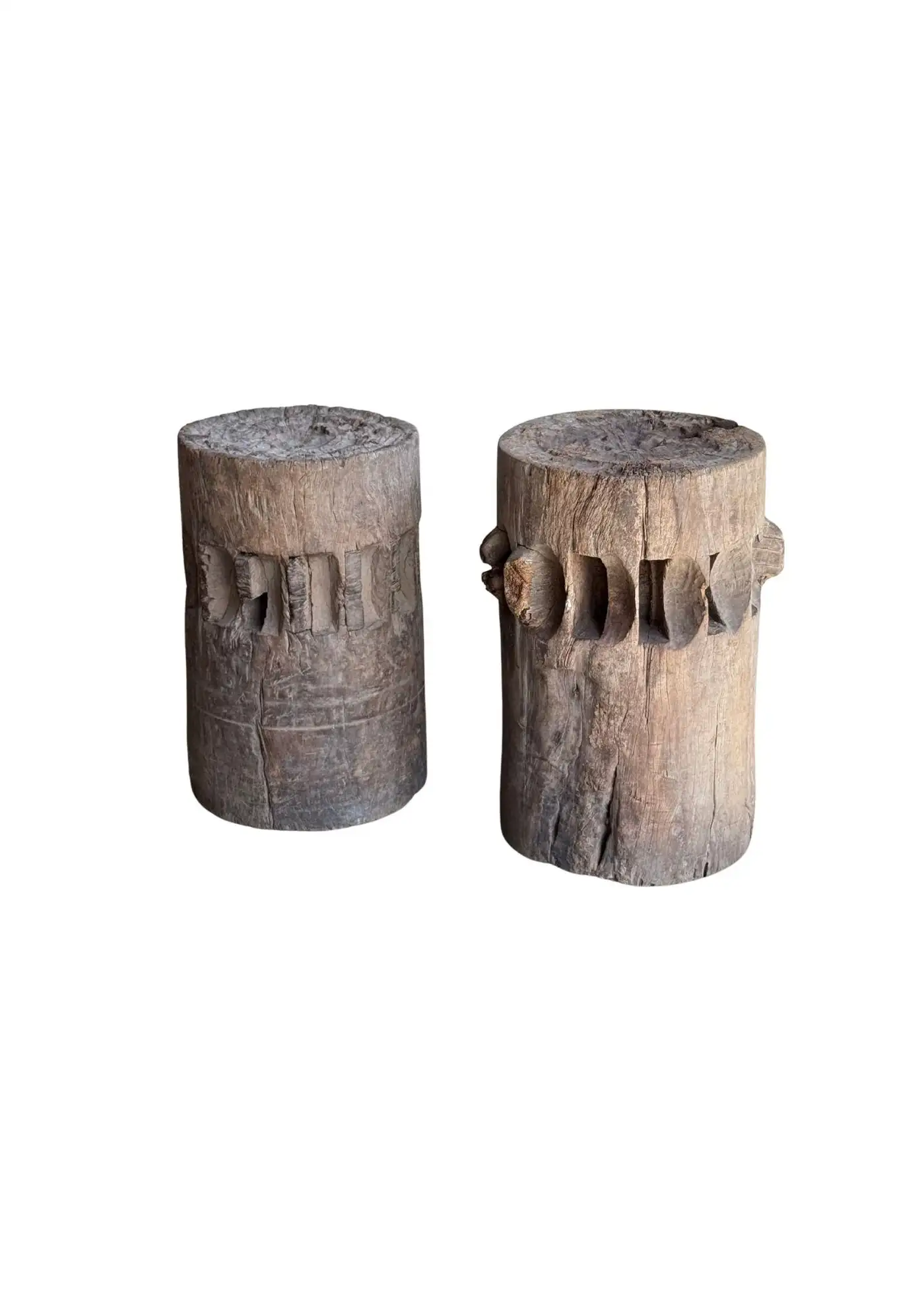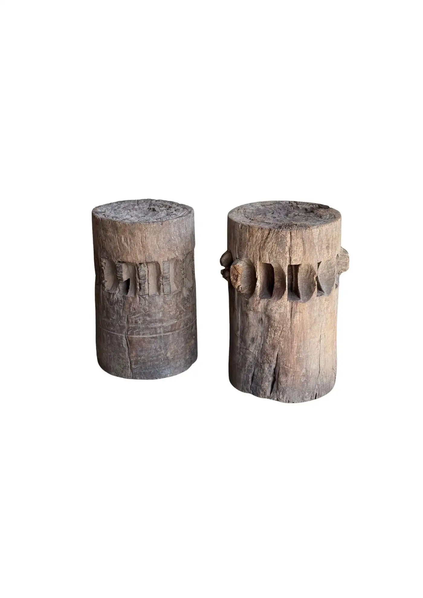 This set of rare antique sugar cane presses stand as a striking example of early agricultural craftsmanship, preserved in their true, unrestored form. Made from solid teakwood, they features stunning, timeworn textures and a deep, natural patina that can only develop through decades of exposure and use. Every surface tells a story—from the weathered wood grain shaped by years of labor to the subtle marks and imperfections that speak to their utilitarian past. Despite their age, the structure remains robust, a testament to the quality of the materials and the skill of its makers. Free from modern restoration, these pieces maintain their authentic character, making them an exceptional collector’s item or a bold decorative statement. Whether displayed in a rustic interior, a heritage collection, or as a sculptural focal point, these sugar cane presses are a true relic of history—raw, honest, and beautifully aged. Detailed Dimensions; Shorter Press: Height 29.5cm (11.61″) x Diameter 27cm (10.62cm)/ Taller Press: Height 49.5cm (19.58″) x Diameter 30cm (11.81″) Diameter with extensions; 33cm (12.99″)