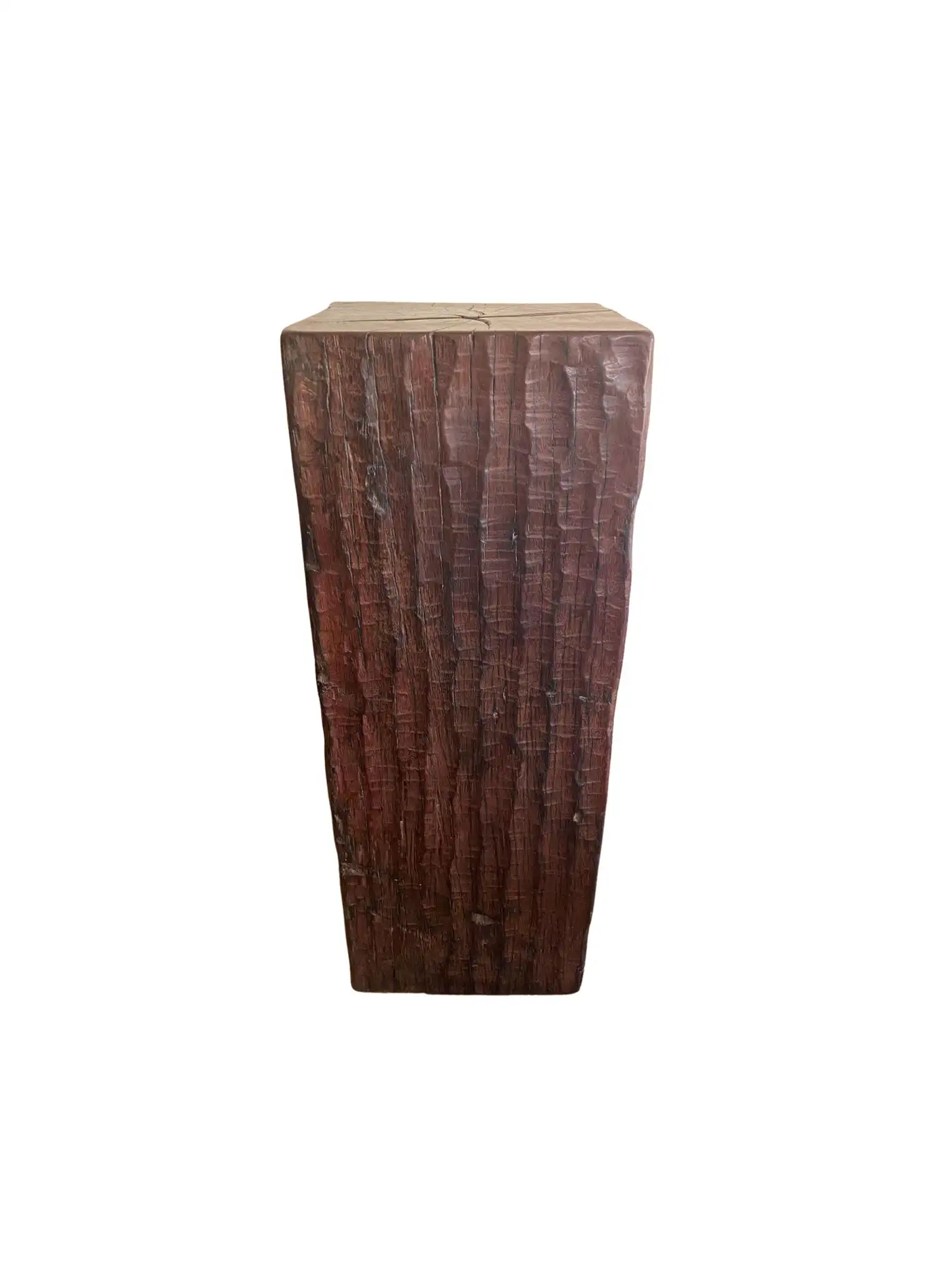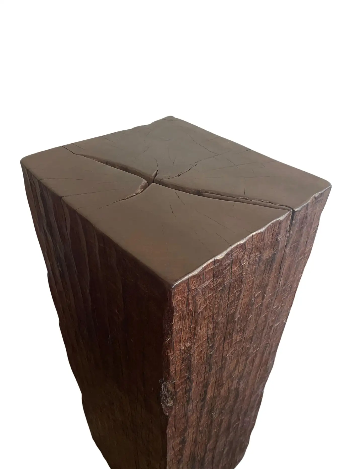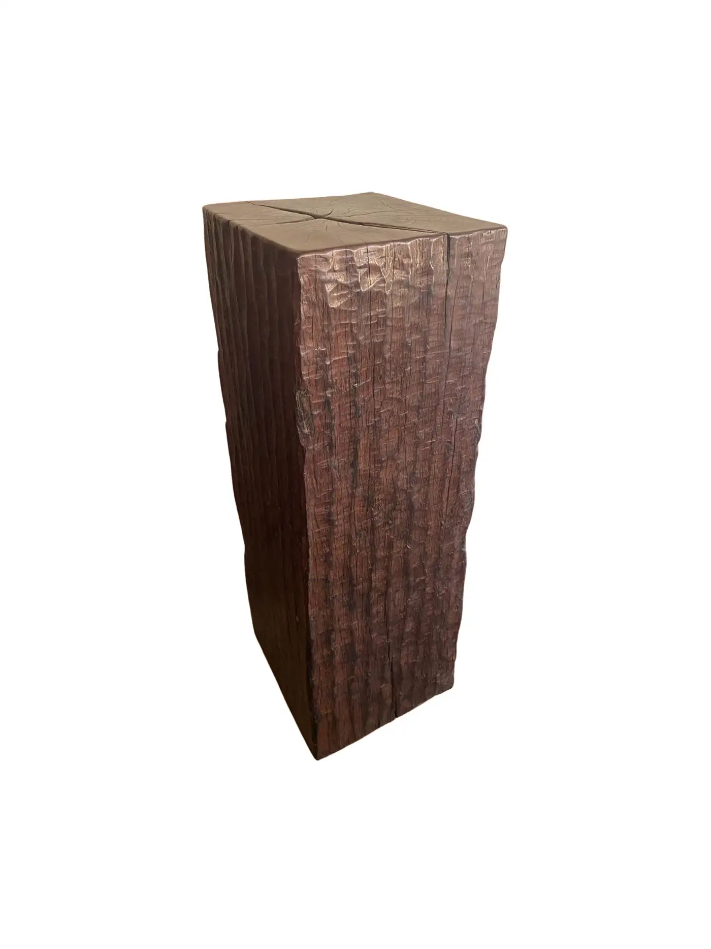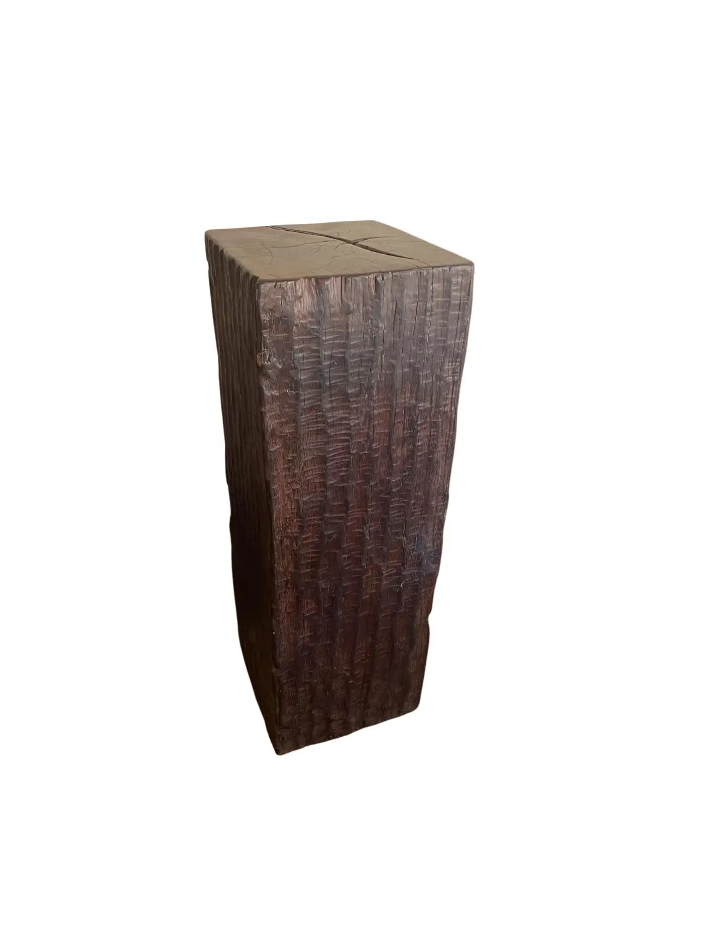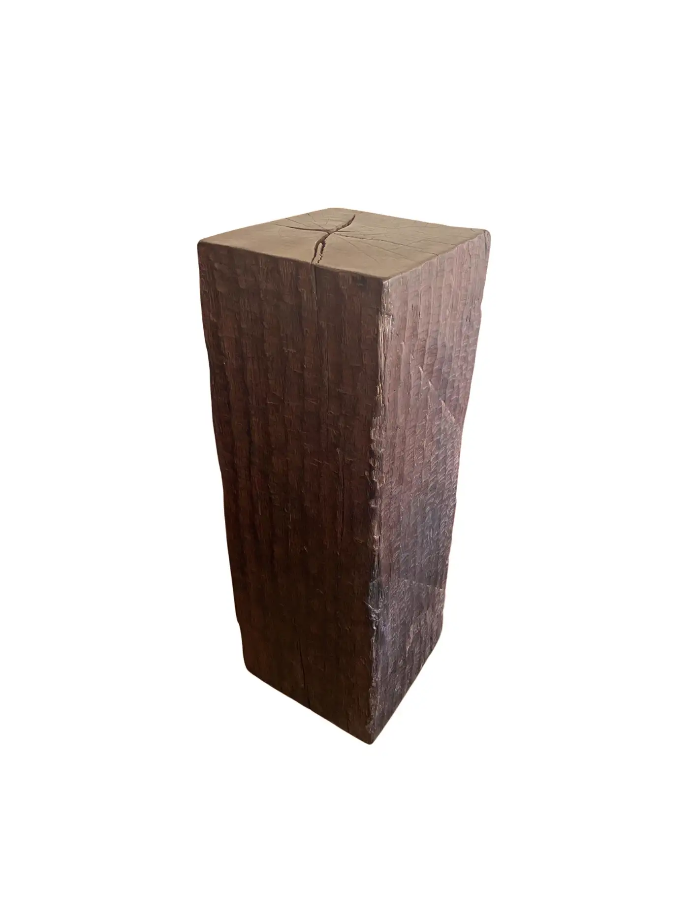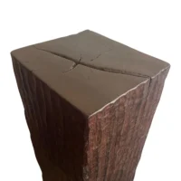 An incredibly heavy and solid Iron Wood Pedestal sourced from Kalimantan, Indonesia. This lovely sculptural object was crafted from a solid block of wood. A raw and organic object with beautiful textures. Indonesian Iron Wood, or “Ulin” as it is commonly referred to is the hardest wood found in the interior rainforests of Kalimantan. The indigenous tribes of the island use this wood in buildings and structures as well as their creative and ceremonial artefacts and tools. It is its near indestructible nature that makes it a popular choice and highly sought after wood. This particular pedestal was reclaimed from the interior structure of an old harbour. For Iron wood to reach 30cm in Diameter it takes on average more than 120 years. This pedestal has a width of 40cm and is 35cm deep, reflecting incredible age. Ulin is incredibly durable, resistant to termites and other pesticides. A wonderful and versatile piece that is beautiful and sculptural on its own, or a wonderful platform to display items.