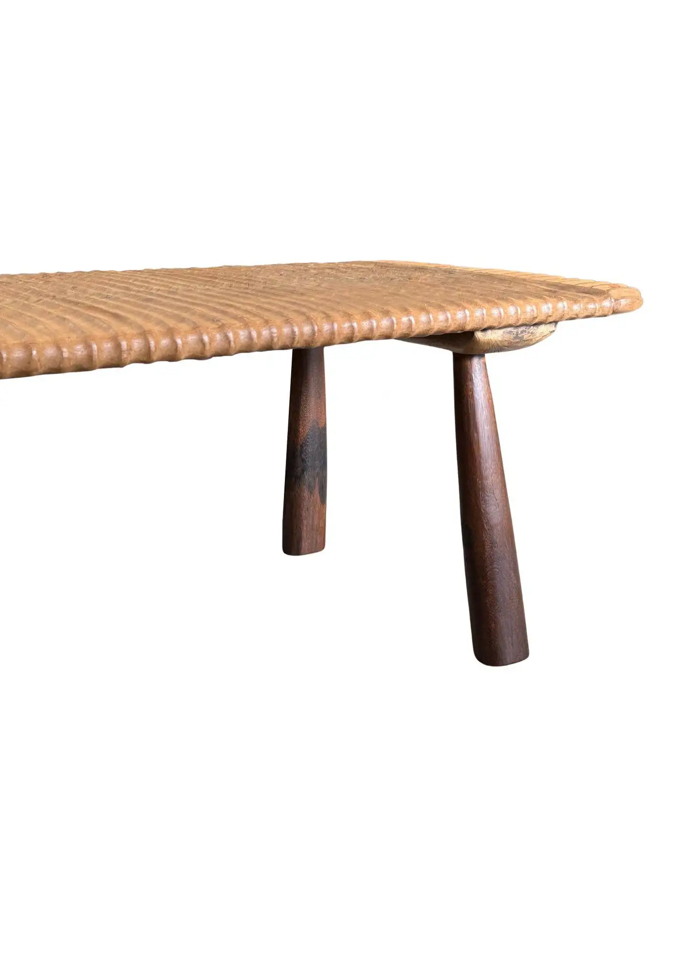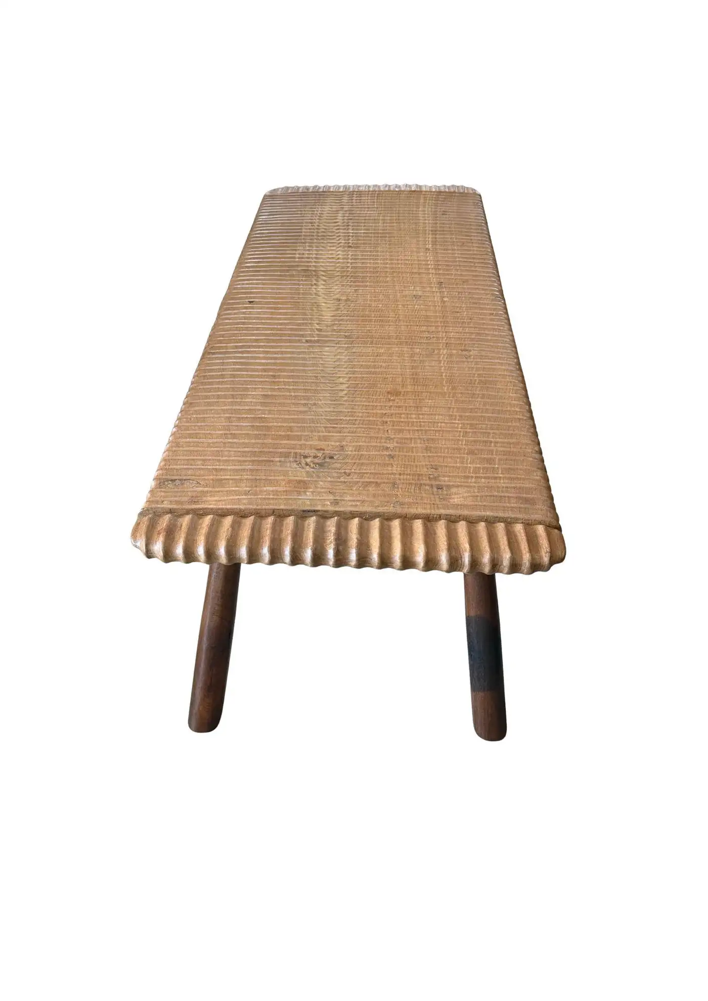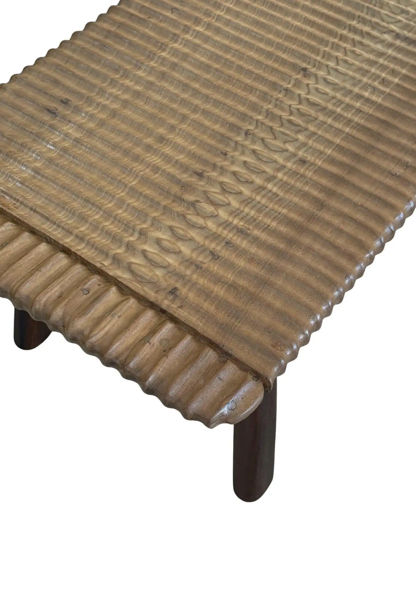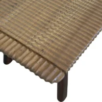This teak wood sofa table is a refined statement piece, defined by its beautifully carved detailing that runs along the tabletop, adding depth, rhythm, and artisanal character. The surface reveals stunning natural wood textures, each grain and variation celebrating the organic beauty of solid teak and ensuring no two pieces are ever exactly alike. The design is anchored by elegantly contrasting legs finished in a rich dark brown tone, achieved through a meticulous multi-staged burning process. This traditional technique enhances the wood’s natural depth while creating a striking visual contrast against the lighter tabletop. Handcrafted with care and precision, this sofa table balances sculptural detail with timeless functionality—perfect for elevating sophisticated living spaces with warmth, texture, and understated luxury.
