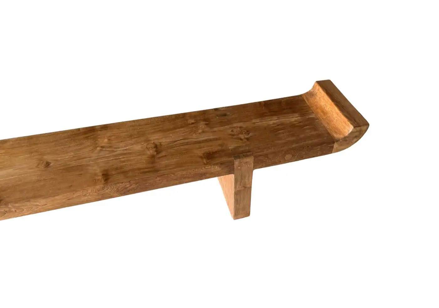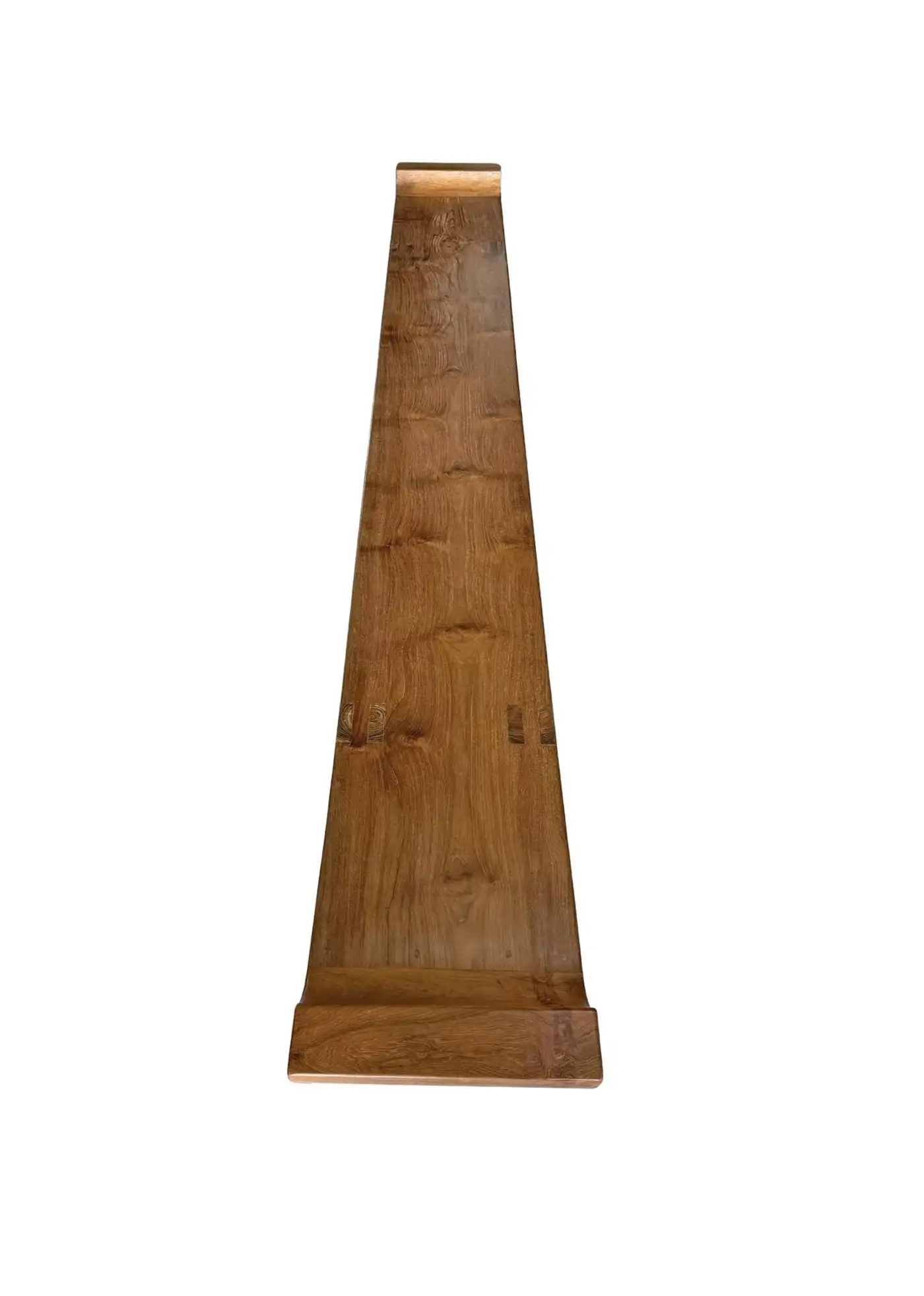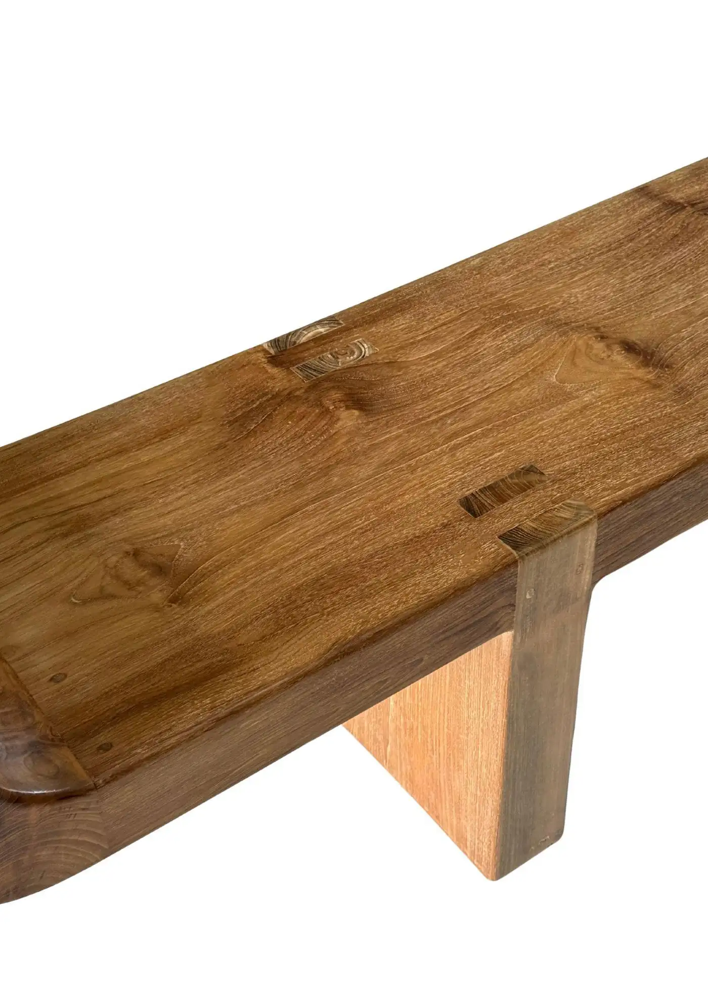 This striking, elongated teak bench is a sculptural statement defined by its refined proportions and expressive natural form. Hand-crafted entirely from reclaimed teak wood, the bench showcases beautifully aged grain patterns, rich tonal variation, and organic textures that tell the story of the timber’s past life. Its very long, linear silhouette is balanced by subtly carved, upturned ends and solid architectural legs, giving the piece both visual lightness and a grounded presence. Each surface is carefully shaped and finished by skilled artisans, preserving the wood’s natural character while highlighting its flowing grain, knots, and gentle imperfections—no two benches are ever the same. Timeless yet contemporary, this bench works effortlessly as a dining bench, entryway statement, or sculptural seating element in refined interiors. Durable, sustainable, and deeply tactile, it is a celebration of reclaimed teak transformed through thoughtful design and meticulous hand craftsmanship.